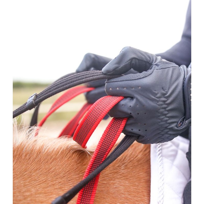 Όταν χρειάζεται, τα ηνία ασφαλείας παρέχουν στον αναβάτη κάτι να κρατηθεί και, μέσω της σύνδεσής τους με το επιστήθιο, ασκούν πίεση στο στήθος του αλόγου, βοηθώντας έτσι στην επανάκτηση του ελέγχου του αλόγου